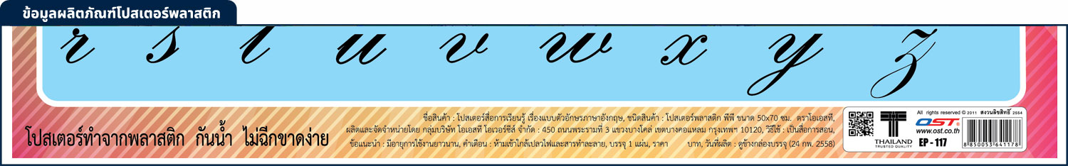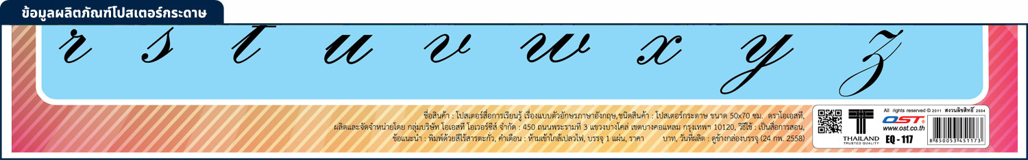 โปสเตอร์ความรู้ แบบตัวอักษรภาษาอังกฤษ EP-117 EQ-117 พิมพ์ออฟเซ็ท บนพลาสติกพีพี และ กระดาษอาร์ตมัน แบบเขียนตัวพยัญชนะ ภาษาอังกฤษ เช่น ตัวเขียนเล็ก ตัวพิมพ์ใหญ่ เป็นต้น เป็น พื้นฐานการเรียนรู้ ภาษาต่างประเทศ ภาพพิมพ์ และ ข้อความ คมชัด ชัดเจน