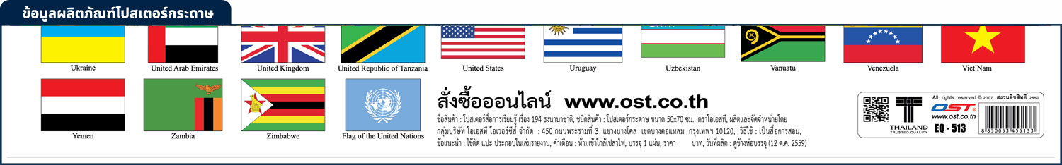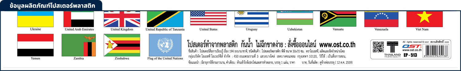 โปสเตอร์ความรู้ ธงนานาชาติ 194 Flags EP-513 EQ-513 พิมพ์ออฟเซ็ท บนพลาสติกพีพี และ กระดาษอาร์ตมัน ภาพธงชาติ ของประเทศต่างๆ 193 ประเทศ พร้อมชื่อประเทศ ภาพพิมพ์ และ ข้อความ คมชัด ชัดเจน
