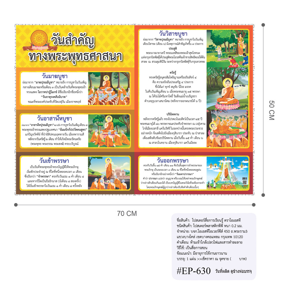 โปสเตอร์ความรู้ วันสำคัญทางพุทธศาสนา EP-630 พิมพ์ออฟเซ็ท บนพลาสติกพีพี เริ่มตั้งแต่ วันมาฆบูชา เดือน 3 วันวิสาขบูชา เดือน 6 วันอาสาฬหบูชา เดือน 8 วันเข้าพรรษา เดือน 8 วันออกพรรษา เดือน 11 ภาพพิมพ์คมชัด อ่านง่ายสบายตา