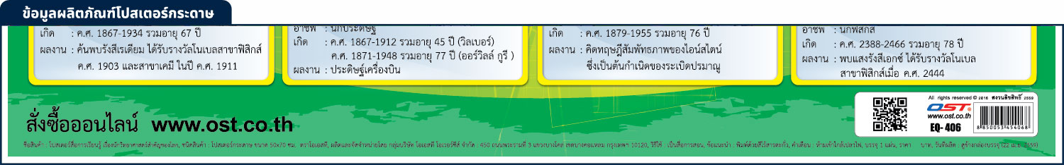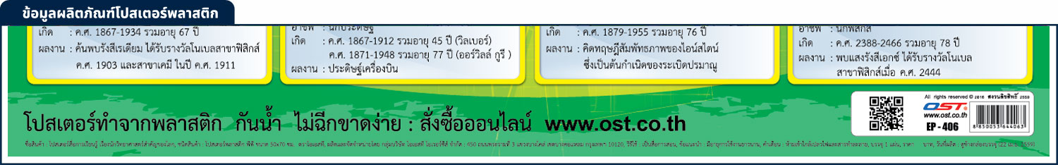โปสเตอร์ความรู้ นักวิทยาศาสตร์ที่สำคัญของโลก EP-406 EQ-406 พิมพ์ออฟเซ็ท บนพลาสติกพีพี และ กระดาษอาร์ตมัน ภาพ ประวัติ และ ผลงานโดยสรุป ของ นักวิทยาศาสตร์ที่สำคัญของโลก เช่น มารี กูว์รี ชาร์ลส์ ดาร์วิน เป็นต้น ภาพพิมพ์ และ ข้อความ คมชัด ชัดเจน