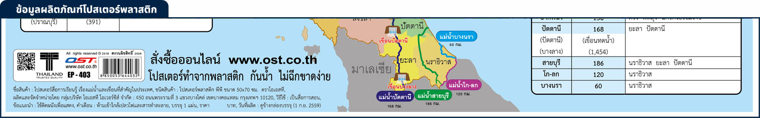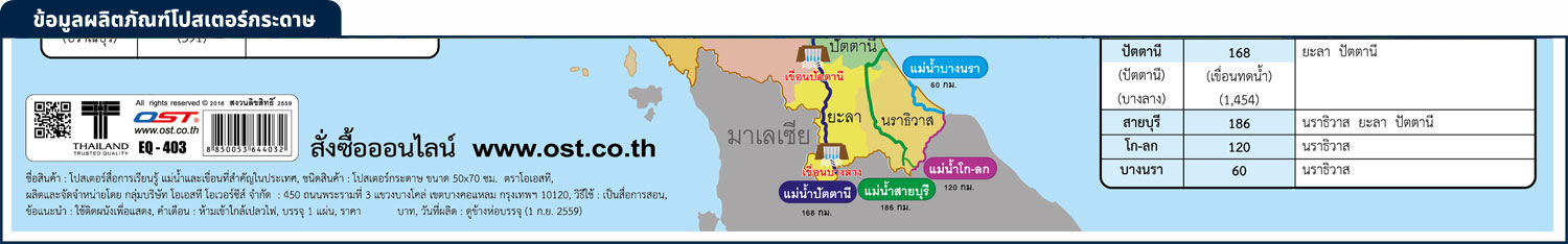 โปสเตอร์ความรู้ แม่น้ำและเขื่อนที่สำคัญในประเทศไทย EP-403 EQ-403 พิมพ์ออฟเซ็ท บนพลาสติกพีพี แผนที่ประเทศไทยแสดงชื่อ เขื่อน และ แม่น้ำ ที่สำคัญ ในจังหวัดต่างๆ ภาพพิมพ์ และ ข้อความ คมชัด ชัดเจน