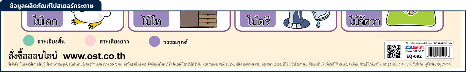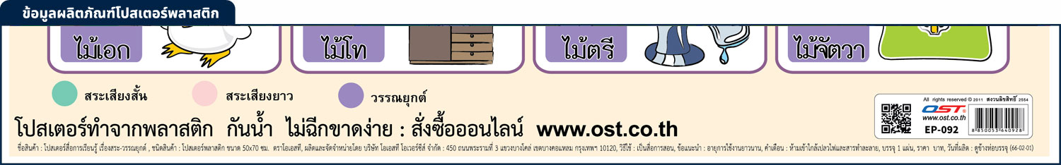 โปสเตอร์ความรู้ สระ-วรรณยุกต์ไทย EP-092 EQ-092 พิมพ์ออฟเซ็ท ภาพ และคำศัพท์ภาษาไทย ที่ใช้สระทั้ง 30 เสียง (ปัจจุบันเลิกใช้ 2 เสียง) และวรรณยุกต์ ไม้เอก ไม้โท ไม้ตรี และไม้จัตวา ภาพพิมพ์ และข้อความ คม ชัดเจน